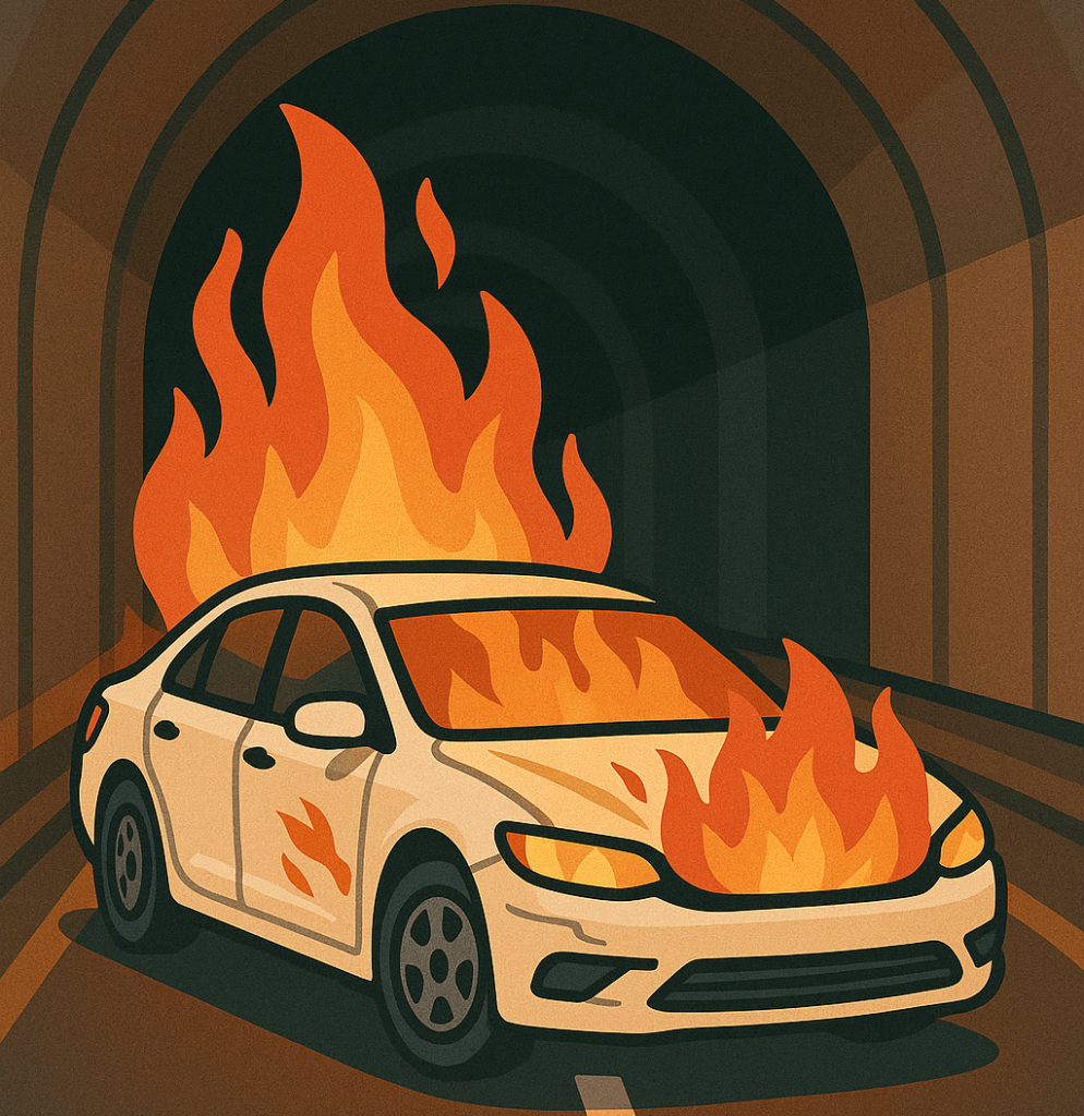 - Posebni primer – požar vozila na viaduktu ali mostu: To ni predor, a omenimo: če vam avto zagori na mostu (viaduktu), podobno ravnajte kot v predoru. Vključite utripalke, poskusite odpeljati z mostu, če pa ne gre, ustavite ob robu. Pogasite z gasilnikom, če zmorete, sicer kličite 112. Pomembno: zapustite most, ker veter lahko raznese ogenj ali dim, pod vami pa lahko kaplja goreče gorivo.